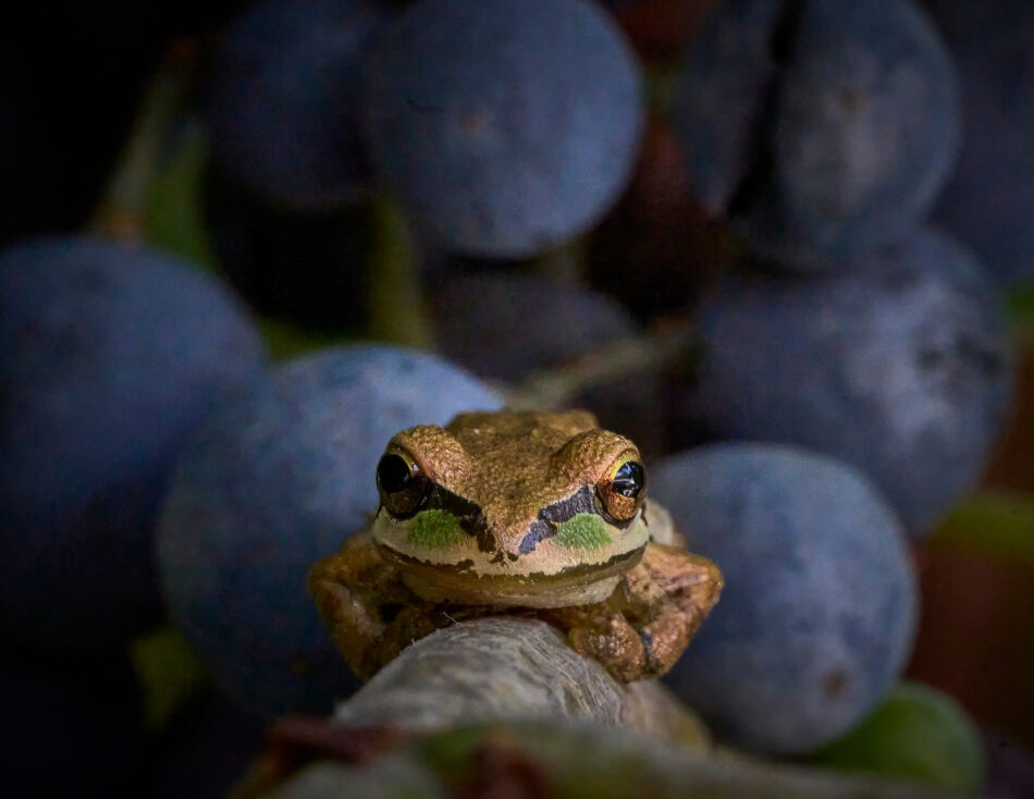 And in the fall the Pacific tree frogs (Pseudacris regilla) become guardians of the grapes. Actually, they sit there when the grapes are ripe and wait for an unsuspecting bee or fly to land in search of grape juice.
