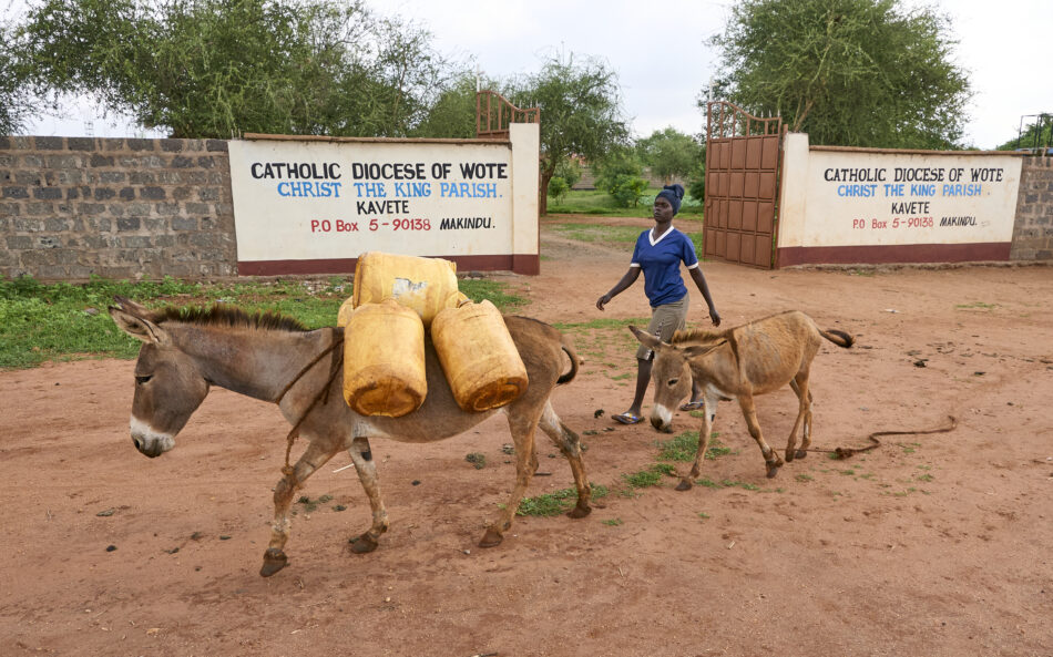 In Kavete, on the other side of Kenya, Regina Mumbua uses a donkey to carry water home from a community water point at Christ the King Catholic Church, where Maryknoll financed a well and storage system that provides water to a community hard hit by the climate crisis. Another woman carries water home on her head.