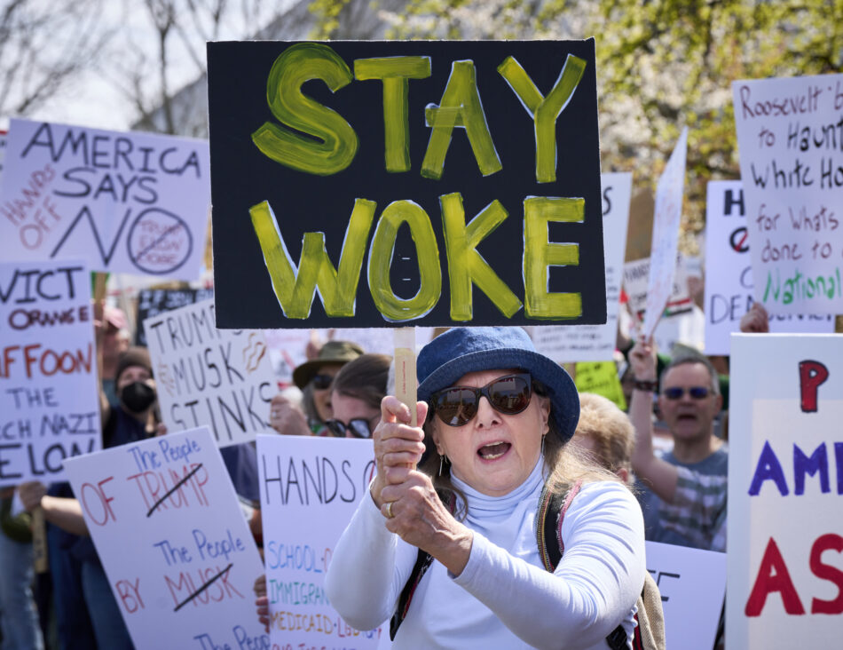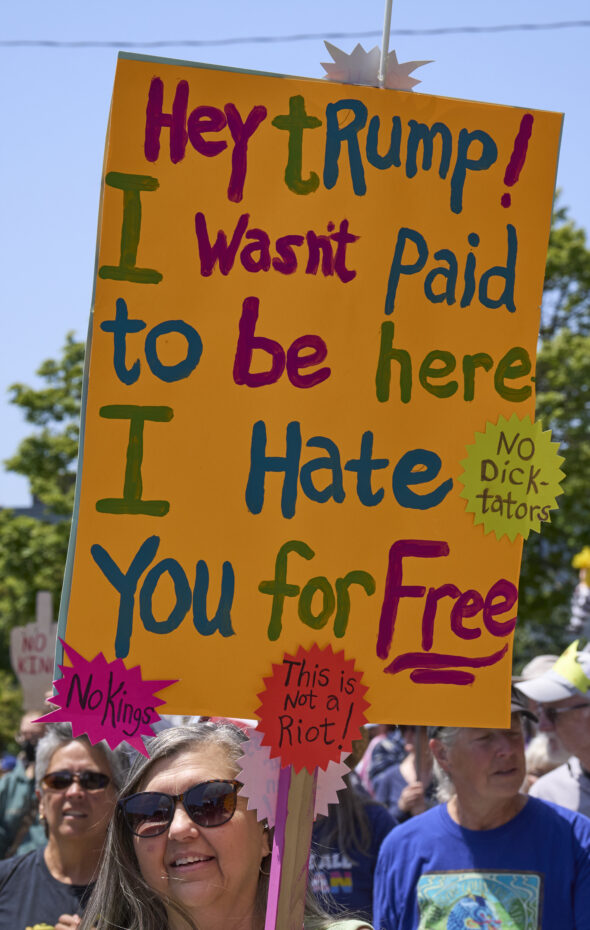 During a No Kings demonstration in Eugene, here’s a woman carrying the burial flag of her father, who fought fascists during World War II.