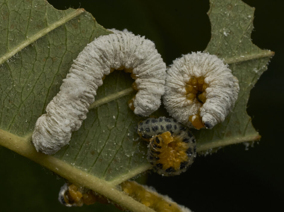 In the fall our Showy milkweed (Asclepias speciosa) puts on a chaotic show about the same time as the nasty Dogwood sawfly (Macremphytus tarsatus) takes up residence on a Red-osier dogwood in my back yard. It migrated to our region from the east coast and is widely considered a pest.